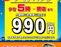 17時からご利用いただけるお得なパックプランのご紹介です。17時以降のご入室時、受付でお食事をご注文いただくと閉店まで990円でご利用いただけます。ドリンクバー込みの価格となります。お食事不要のお客様は1,200円でご利用いただくことも可能です。ゆったりとお過ごしください。